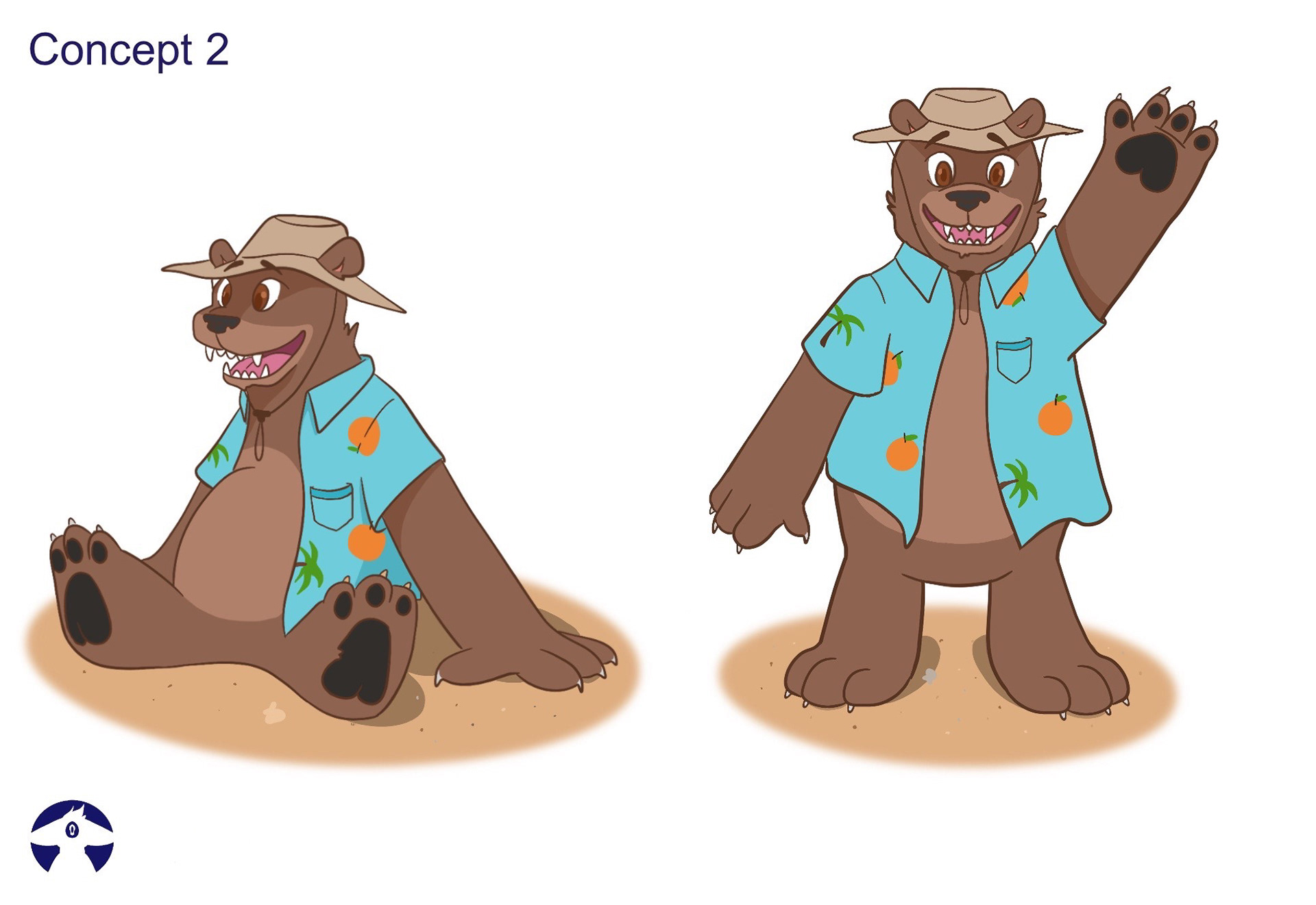 Concept design 2 for the Waldorf Astoria Kids' Klub mascot. I created a brown bear as a nod to the famous Bull and Bear steakhouse on property, as it is not located in all Waldorf Astoria properties. I drew him wearing a tropical short sleeve shirt displaying palm trees and oranges to give it a Floridian touch. Along with his sun hat because it is the sunshine state. This character could be a support character in various formats such as the coloring sheets and postcards.